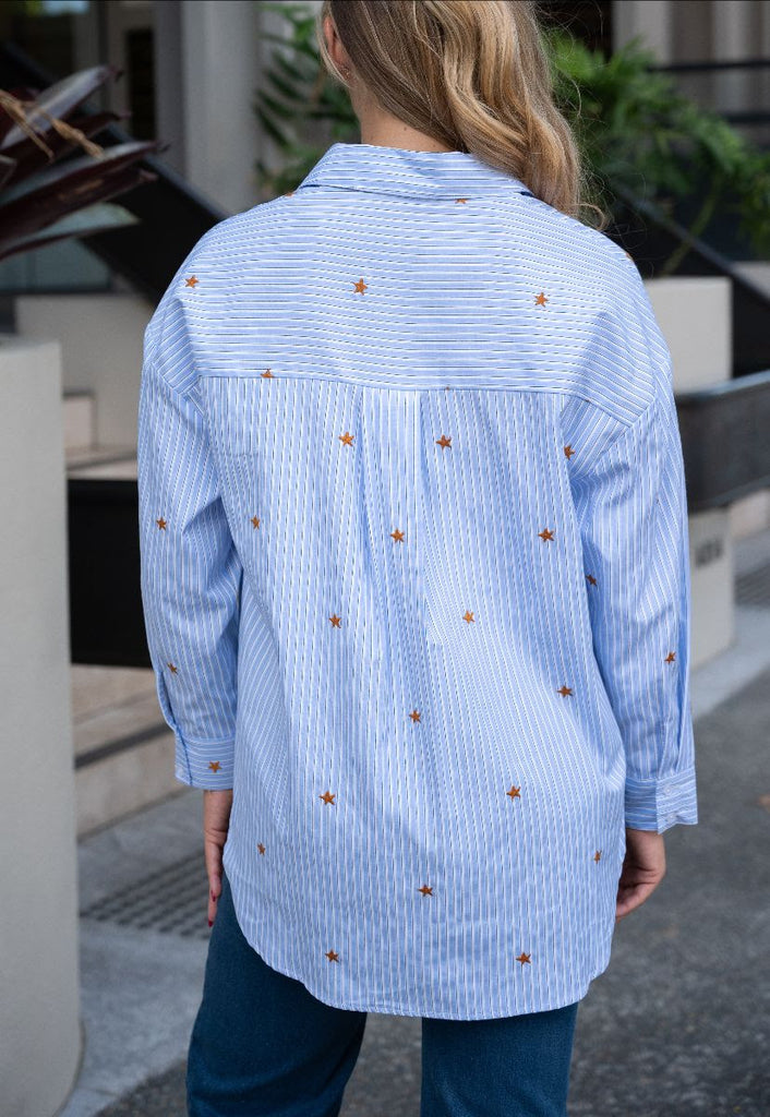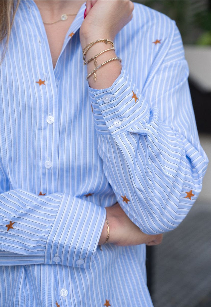 Cute blue and white stripe button up shirt with gold star embroideries . Cold hand wash. Cotton.